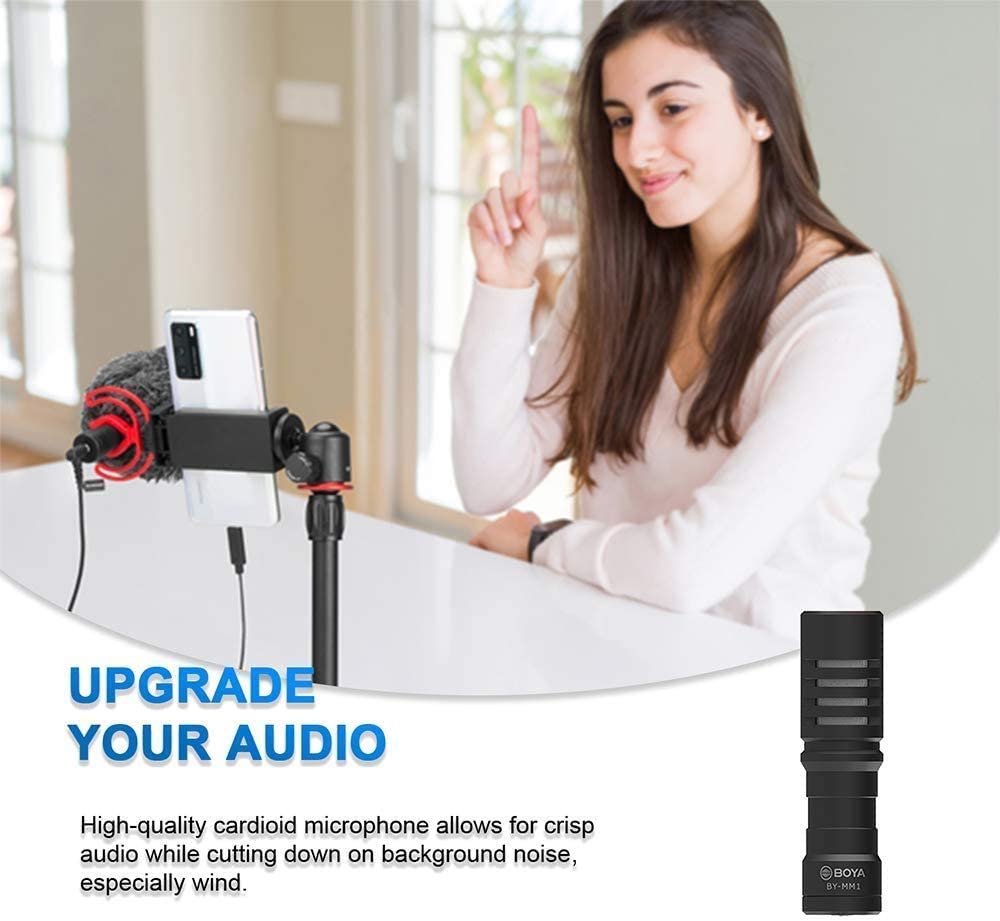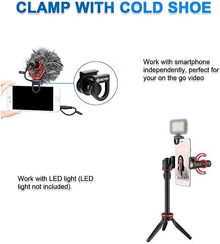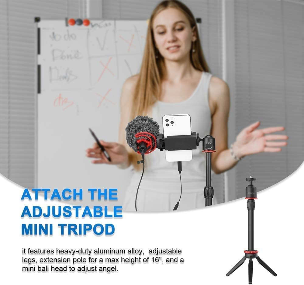 BOYA BY-VG330 es un kit de vídeo universal para smartphone que consta de micrófono condensador BY-MM1, abrazadera para smartphone, cabeza de bola, tubo de extensión, mini trípode, abrazadera con soporte de zapata fría.