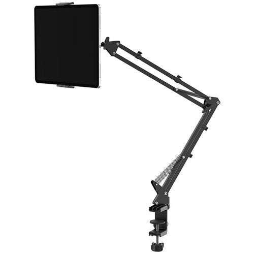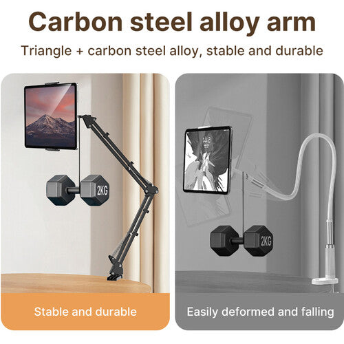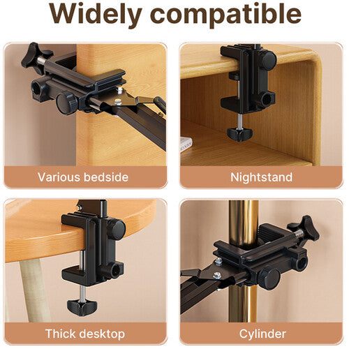 La abrazadera se fija de forma segura a cualquier escritorio, cabecero o poste de hasta 4 cm de grosor o circunferencia. La abrazadera con resorte admite dispositivos de entre 11,7 y 32,5 cm de ancho, lo que la hace ideal tanto para teléfonos como para tabletas grandes.