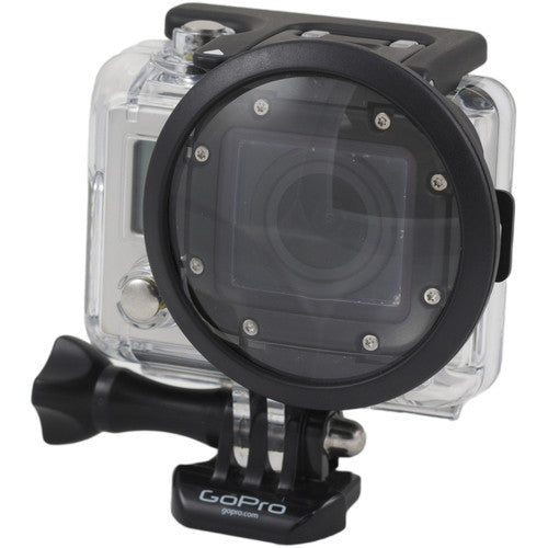 La lente macro Polar Pro se desliza sobre el puerto de la lente de la carcasa de buceo GoPro para la HERO3, HERO3+ y HERO4. Reduce la distancia de enfoque cercano de la GoPro HERO3/HERO3+/HERO4, lo que le permite capturar sujetos entre 3 y 18" desde el objetivo. Una vez conectado, la lente presenta un diseño oscilante que le permite cambiar a tomas no macro sin quitarla de la carcasa. Para garantizar un enfoque correcto, la lente no debe usarse para sujetos a más de 24" de distancia.