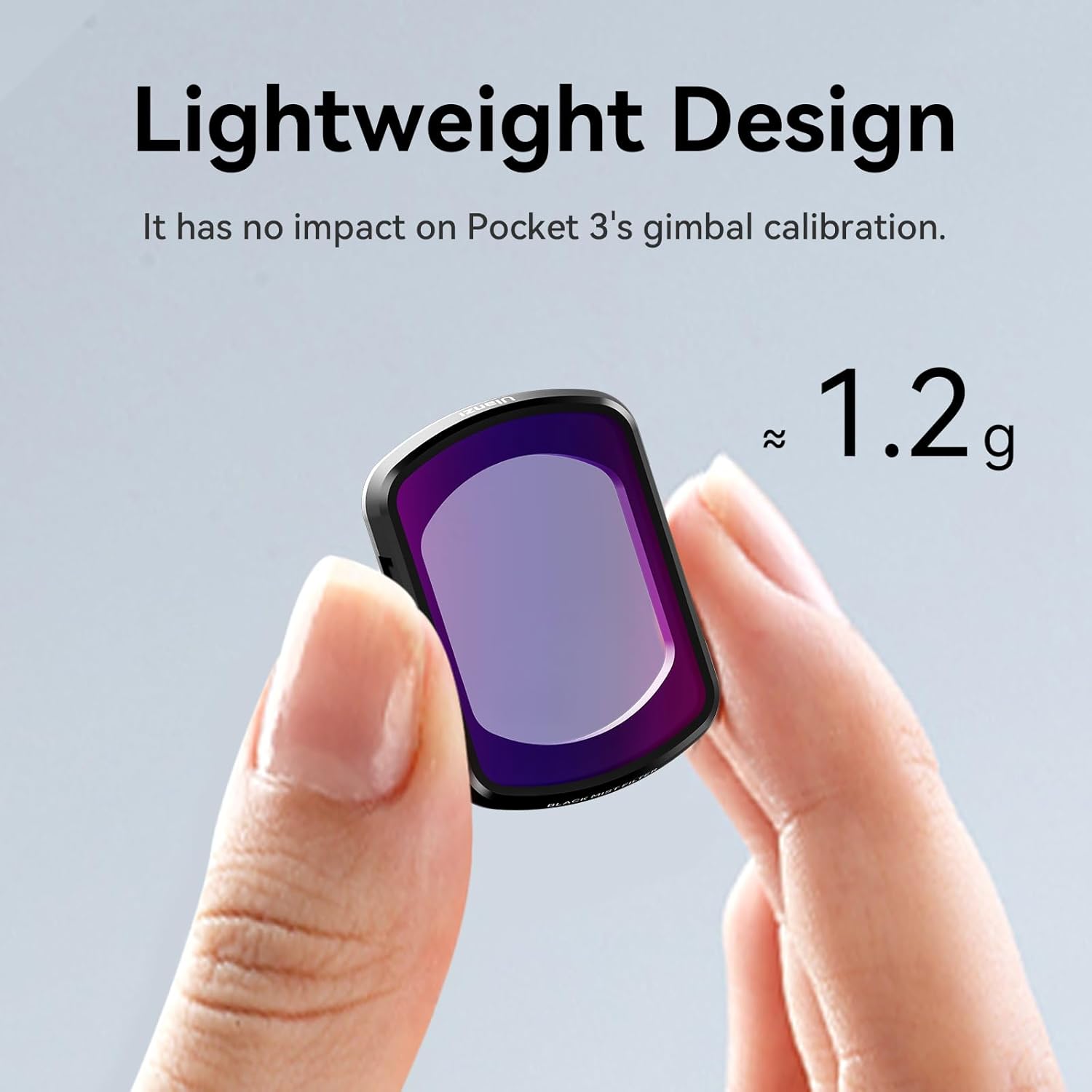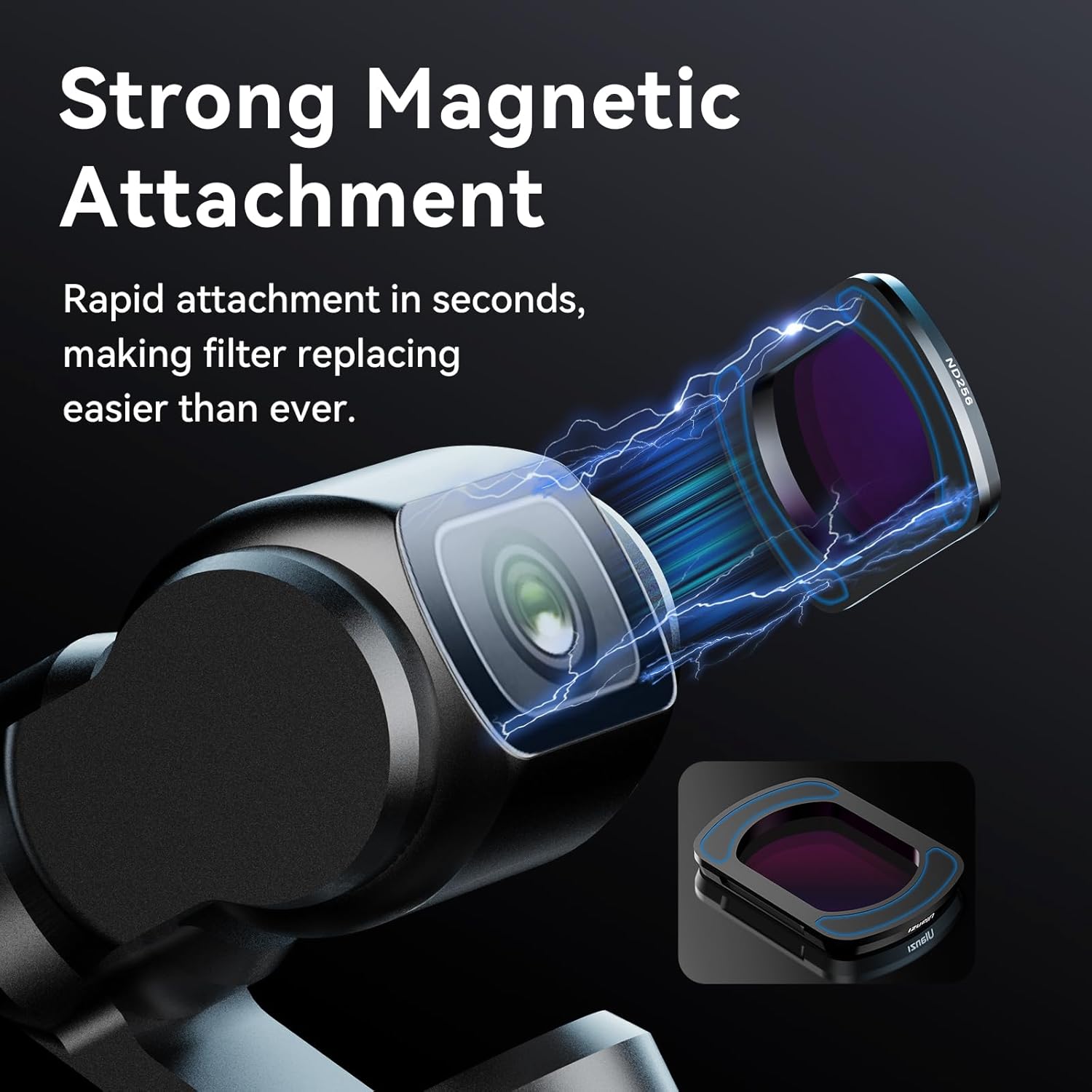 con un accesorio magnético instantáneo y seguro. Cuenta con vidrio óptico HD para imágenes cristalinas durante la grabación de cámara de vlogging, y es un cambiador de juego para los entusiastas de la cámara cardán de mano que buscan optimizar las velocidades de obturación, minimizar el deslumbramiento, enriquecer los colores y lograr una exposición impecable en diferentes condiciones climáticas.
