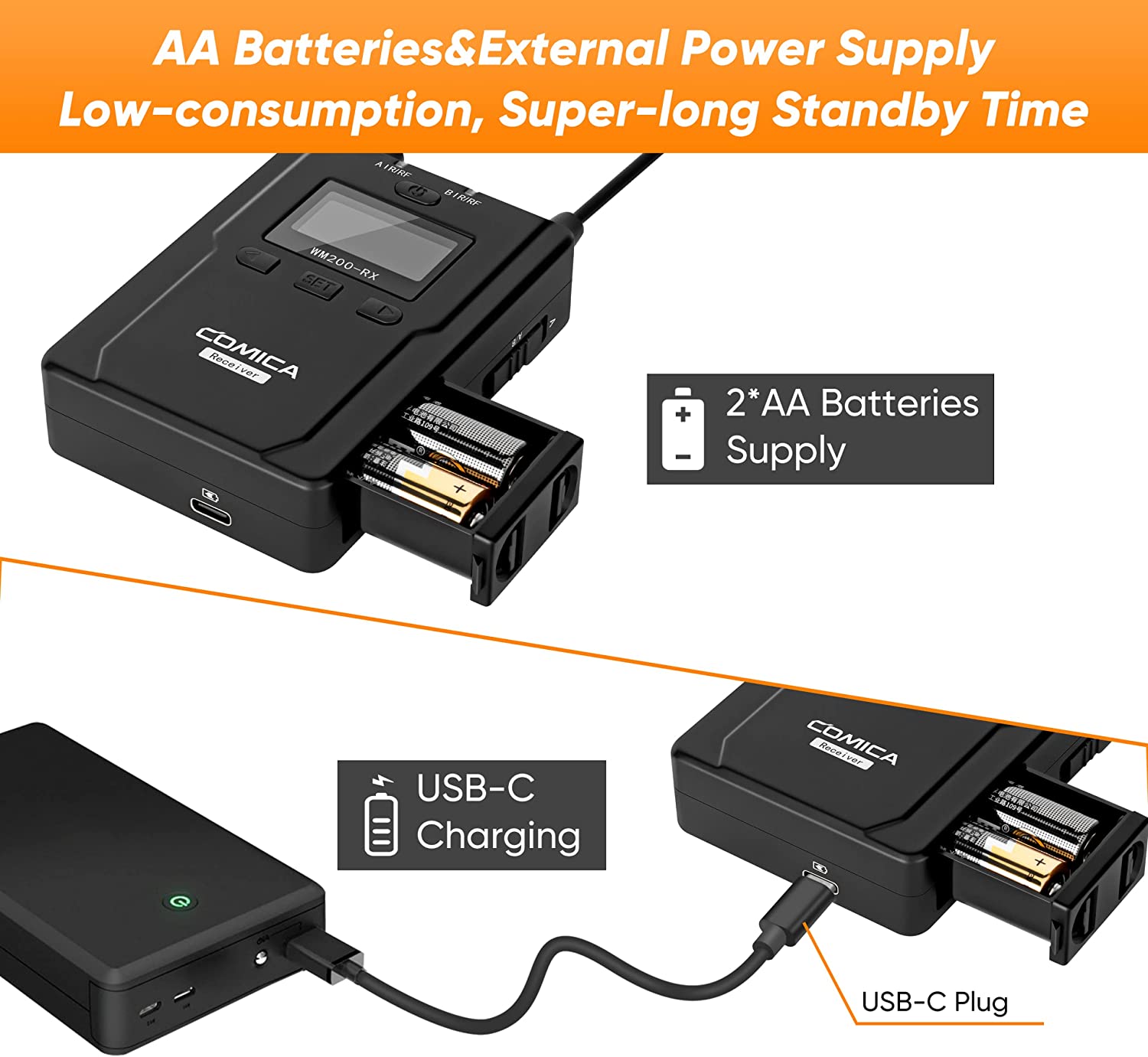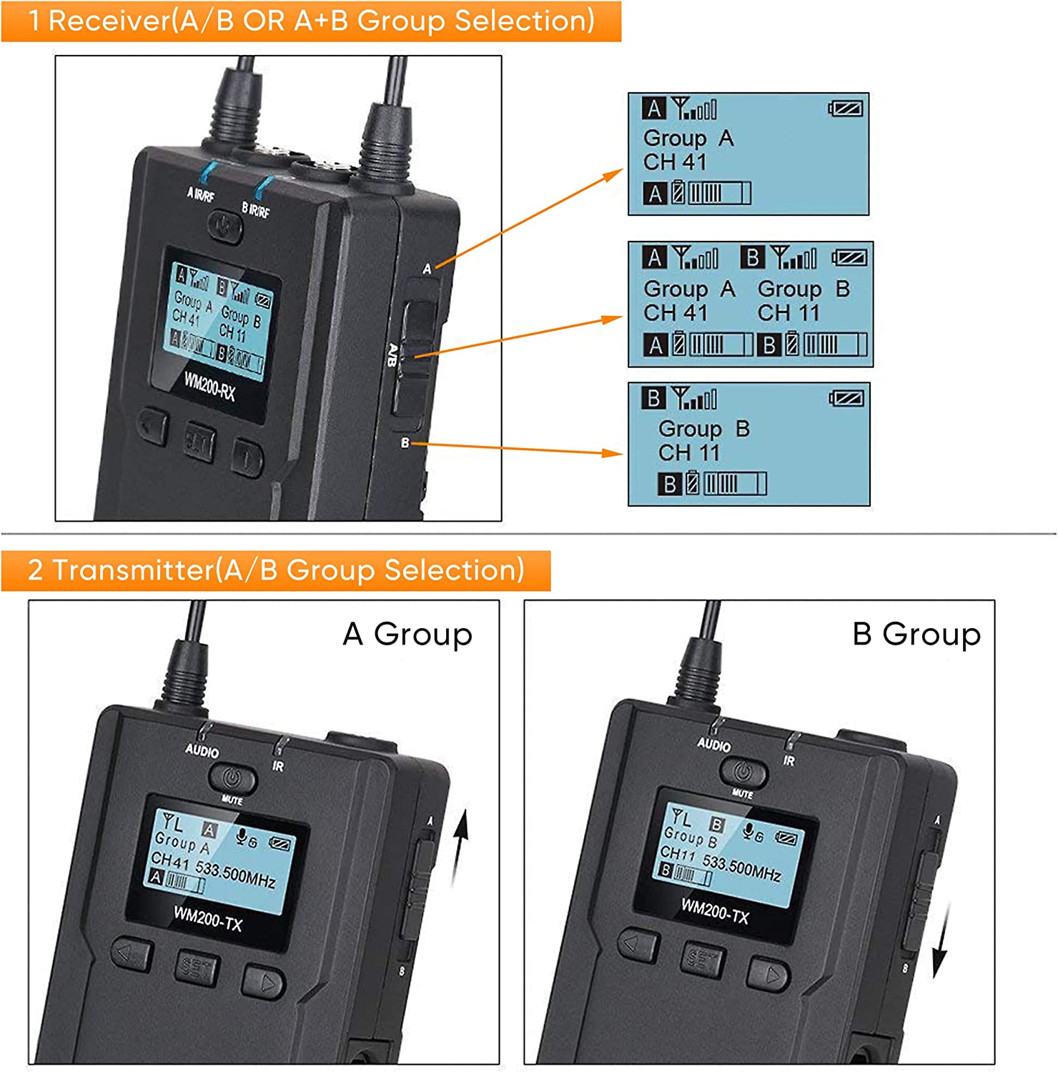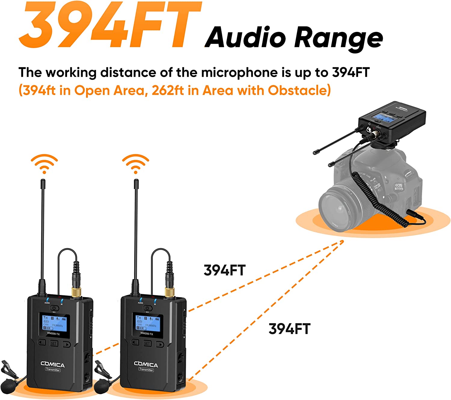 Recomendamos utilizar la exploración automática para seleccionar el mejor canal antes de su uso. Asegúrate de que el modo estéreo esté abierto antes de grabar con tus cámaras. Este producto no contiene baterías, por favor, compra por separado. Para teléfonos inteligentes Android, te sugerimos que necesites descargar la aplicación de terceros para su uso. (Necesitas conectar el adaptador TRRS al receptor antes de grabar con tus smartphones, TRRS no incluidos). Para evitar interferencias con tus grabaciones, cierra tus walkie-talkies, teléfono móvil u otro dispositivo inalámbrico cuando lo utilices. Puedes conectar de 2 a 4 receptores de micrófono inalámbricos (4 a 8 transmisores) al mismo dispositivo para uso multipersona a través del transmisor de audio Comica CVM-AX1/CVM-AX3. (Mezclador de audio no incluido)
