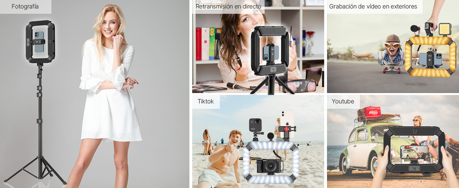 【Diseñado con 3 zapatos fríos】puedes fijar con luz de relleno, micrófono o soporte de asa, etc. Hay 4 superficies emisoras de luz ajustables. La superficie emisora de luz se puede cambiar libremente de acuerdo a diferentes escenas