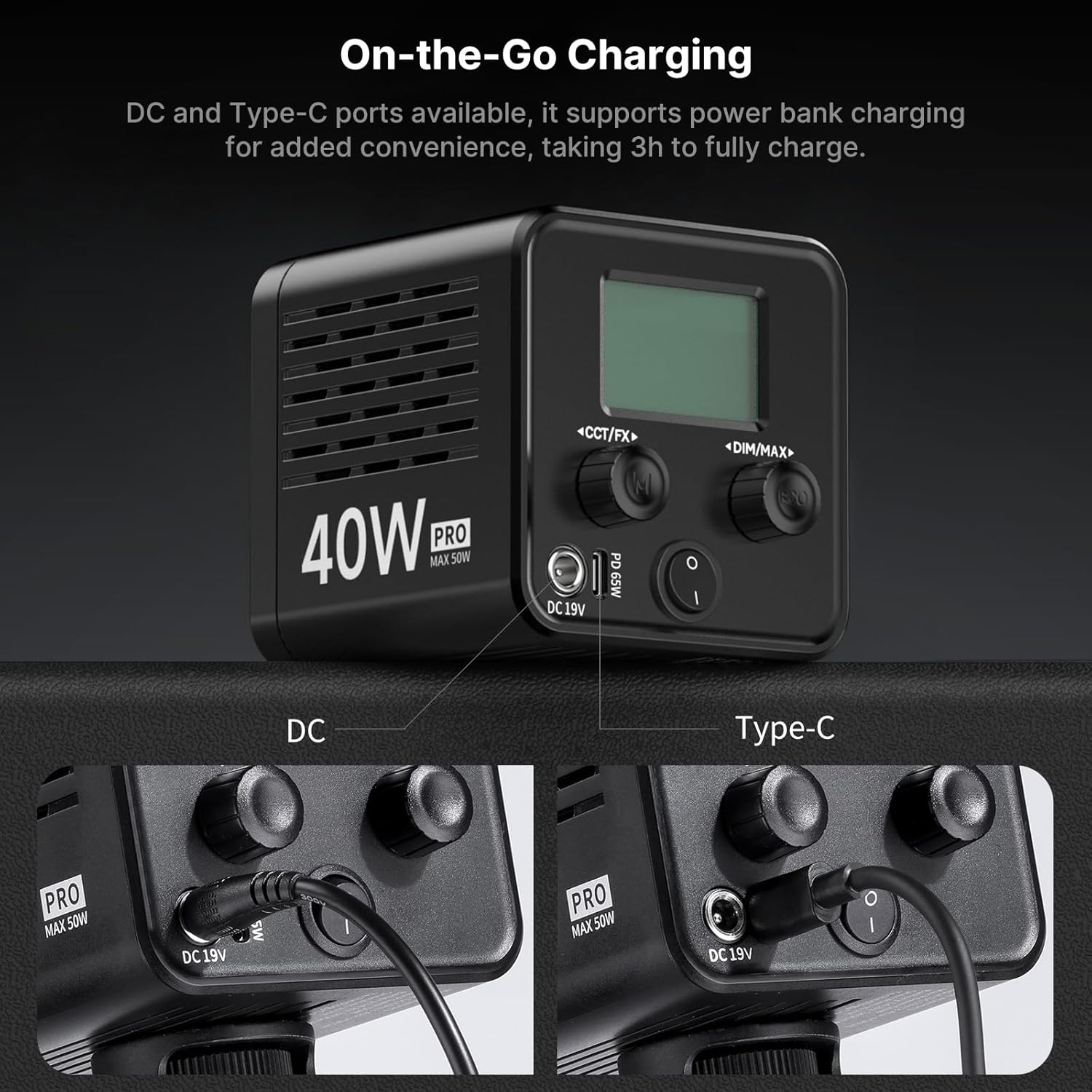 Recientemente actualizado 40W PRO La luz de video LED mejorada con un nuevo puerto de carga TYPE-C, que se puede conectar a un banco de energía externo y se puede cargar completamente en 3 horas.