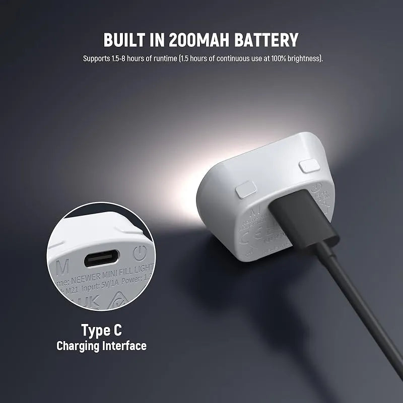 Luz LED compacta y recargableLa luz auxiliar NEEWER M21 para DJI OSMO Pocket 3 es un accesorio de iluminación compacto y ligero con una batería recargable integrada de 200 mAh. Proporciona de 1,5 a 8 horas de funcionamiento (1,5 horas con un brillo del 100%) y se recarga mediante un puerto USB-C con un cargador portátil o fuentes de alimentación USB. Forma parte de la línea NEEWER BASICS, que ofrece productos esenciales sin extras innecesarios.