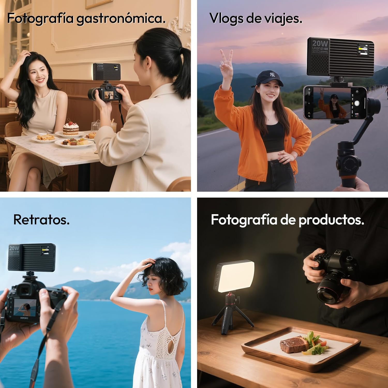 Con su diseño delgado, modos de iluminación versátiles y empuñadura lateral ergonómica, la luz RGB para cámara es fácil de sostener y ajustar con una sola mano.