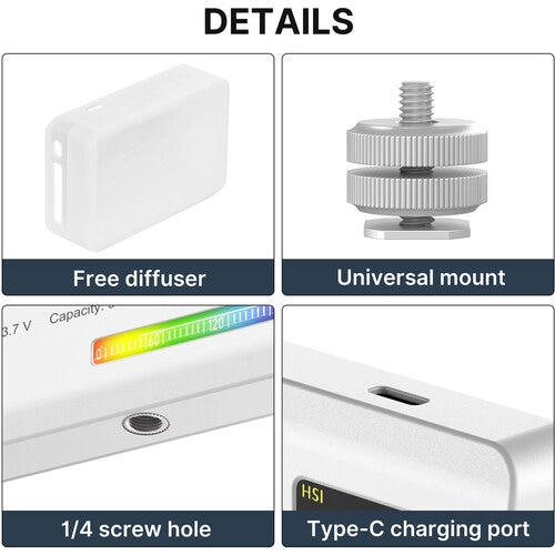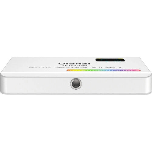 La compacta luz de video LED Ulanzi VL120 RGB es una unidad LED versátil que cuenta con selección de color RGB, una temperatura de color variable de 2500 a 9000K, atenuación de 0 a 100% y 20 efectos de iluminación. Compacta y lo suficientemente ligera como para deslizarse en su bolsillo, la batería integrada de 3100 mAh del VL120 se carga completamente en aproximadamente 2.5 horas utilizando el cable USB tipo C incluido. Esta luz LED tiene una pantalla de visualización OLED e incluye una rosca de montaje de 1/4 "-20 y un adaptador de zapata fría para montar en su cámara o plataforma.