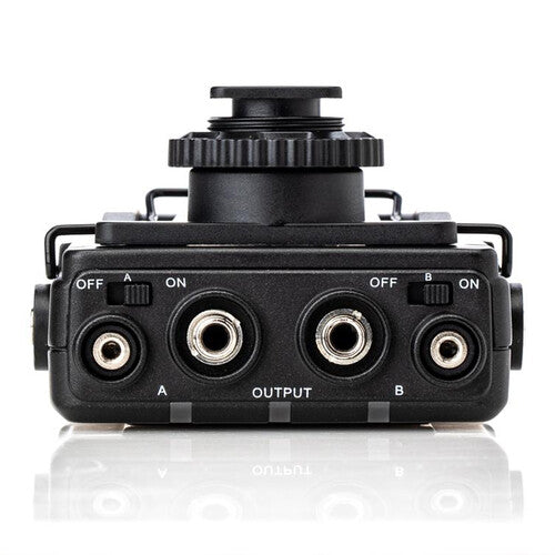 El receptor de montaje en cámara de dos canales está equipado con dos salidas de audio de 3,5 mm. Viene con una variedad de cables para conectar cámaras DSLR/sin espejo, videocámaras profesionales, grabadoras, mezcladores e interfaces de audio con entradas de micrófono de 3,5 mm o XLR. El receptor cuenta con una entrada externa de micrófono/línea (con alimentación de enchufe), lo que le permite mezclar un micrófono con cable, un mezclador o incluso un segundo sistema inalámbrico en la cámara con facilidad. Si su cámara no tiene un conector para auriculares, puede monitorear su sonido a través de la salida de auriculares de 3,5 mm del receptor mientras graba para asegurarse de que está capturando una señal limpia.