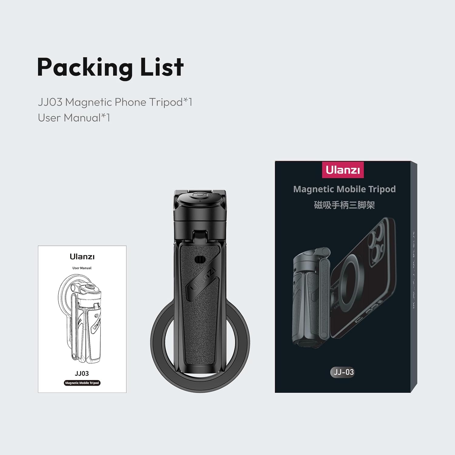 【Succión magnética dual y adsorción instantánea】Con una potente succión magnética de doble cara, el JJ03 permite el uso simultáneo de su teléfono y otros accesorios magnéticos de forma segura y sin deslizamiento. Simplemente acerca tu teléfono a la parte magnética para adsorberlo al instante. Para los casos que reducen la fuerza magnética, utilice el anillo magnético incluido para una mejor compatibilidad
