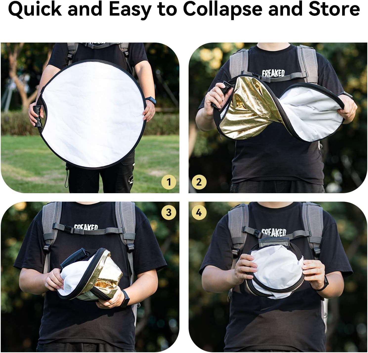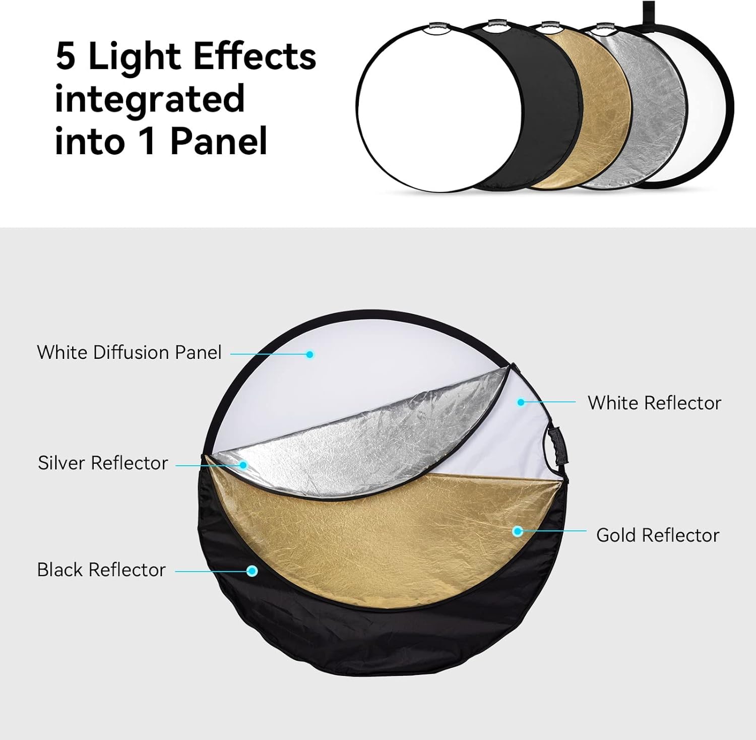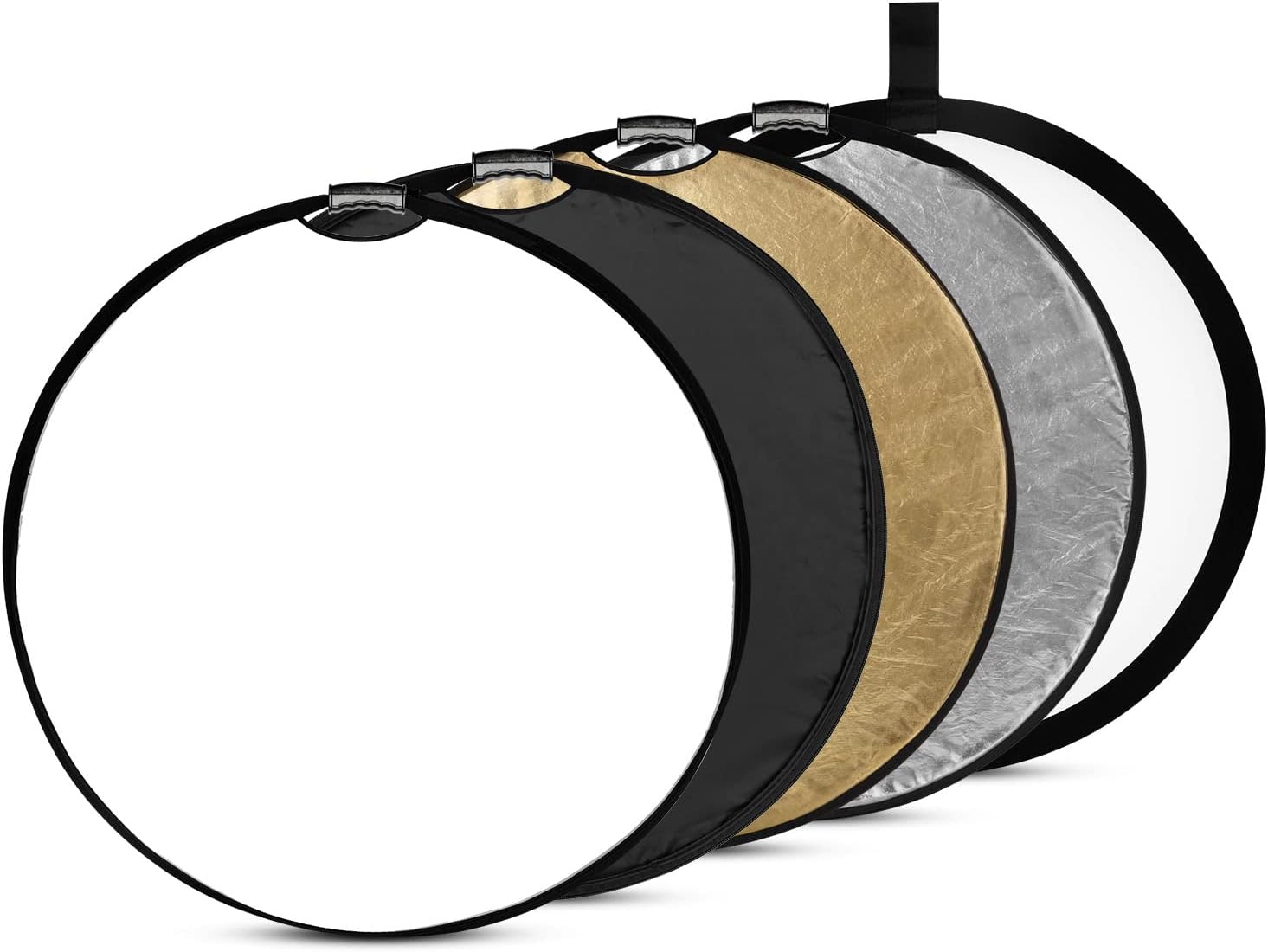 Ofrece superficies doradas, plateadas, blancas y negras, y un panel difusor, ideal para iluminar objetos y retratos. Incluye una bolsa de transporte negra para facilitar su almacenamiento y transporte.