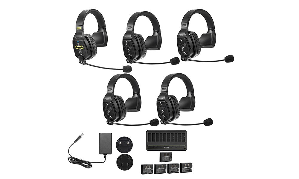 El Saramonic WiTalk WT5D es un sistema de auriculares con intercomunicador inalámbrico full-duplex que permite que hasta cinco personas se comuniquen de dos vías simultáneamente, mientras caminan libremente.