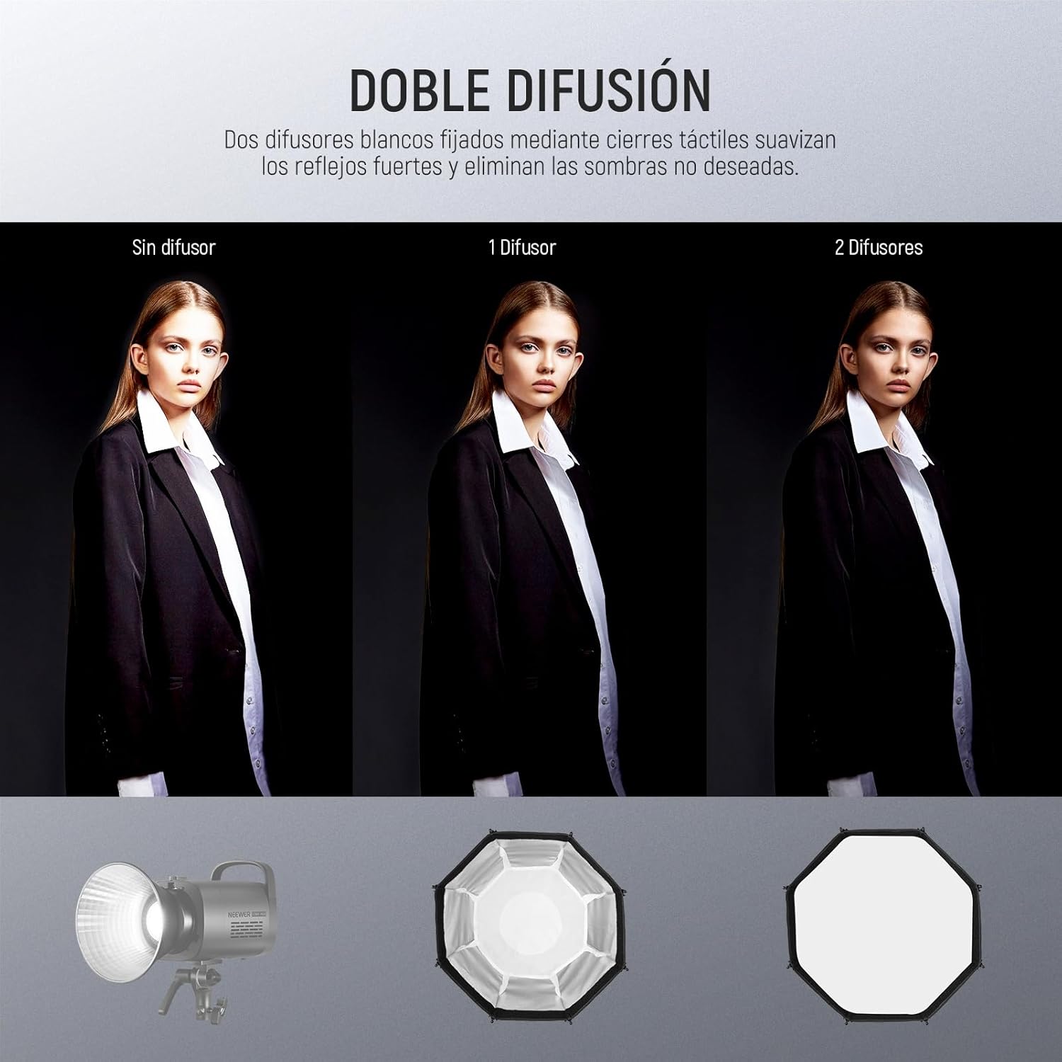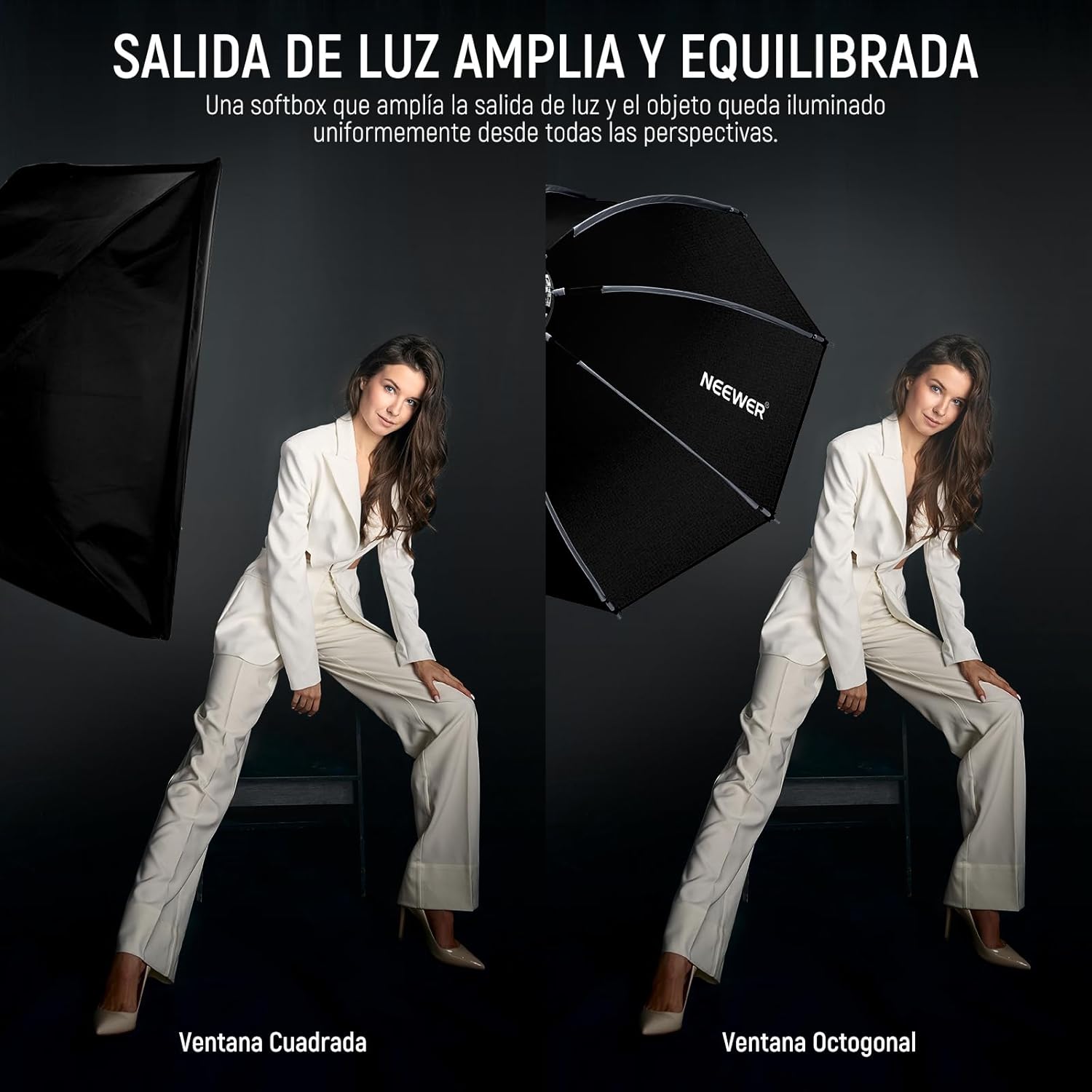 【Softbox octogonal de alta calidad】Eleva tu retrato, bodas, fotografía de moda, grabación de vídeo, transmisión en vivo y entrevistas con este softbox octogonal esencial de 70 cm. Los interiores plateados intensifican la fuente de luz mientras mantienen el color verdadero. Incluye difusores y una rejilla para suavizar el deslumbramiento y eliminar las sombras. Ligero (978 g) con una estructura de portabrocas de aleación de nailon y una bolsa de transporte para portabilidad al aire libre.