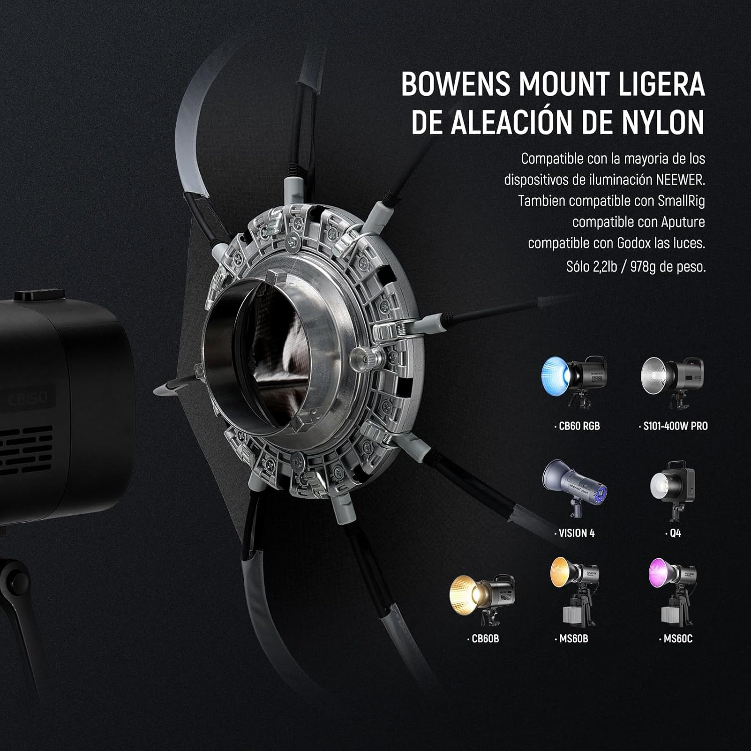 【Soporte Bowens estándar】 Con el soporte Bowens estándar, esta caja de luz se puede conectar a los monolights NEEWER y luces de video continuas y monolights estroboscópicos como CB60, CB100, CB150, CB60B, RGB CB60, CB200B, MS60B, MS60C, MS150B, S101-300W/400. 4, 4, 4, 4, P4. Compatible con SmallRig compatible con Aputure 120d compatible con Godox sl60w, etc.