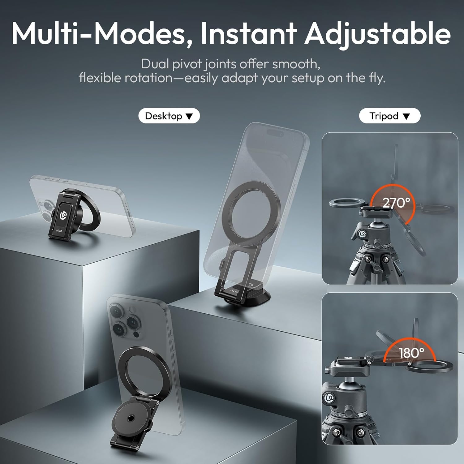 Puerto de tornillo universal de 1/4 pulgadas. Desata creatividad: el soporte magnético para teléfono Ulanzi puede conectar fácilmente trípodes, brazos mágicos o palos para selfie para filmar estable, ángulos dinámicos o tomas grupales. Ideal para creadores de contenido, vloggers de fitness y fotógrafos. No requiere adaptadores: amplía tu configuración para llamadas Zoom, sesiones al aire última intervención, vídeos de recetas de cocina o transmisiones en vivo con este versátil soporte para teléfono.
