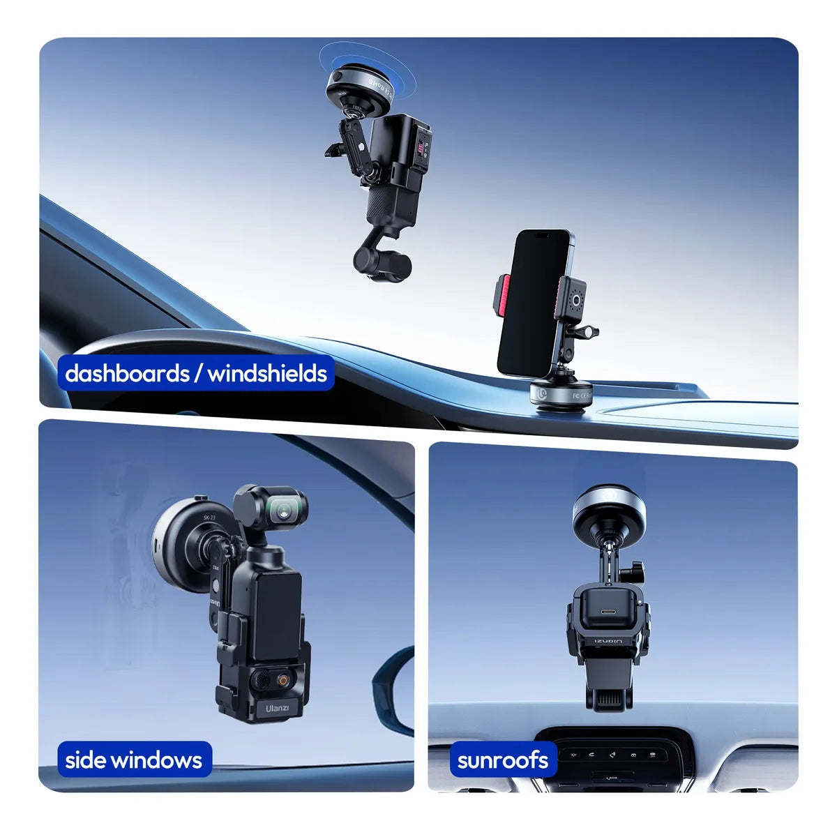 Aplicación: Este soporte es ideal para vloggers, conductores y creadores de contenido que necesitan un soporte portátil y base confiable. Funciona con cámaras de acción, teléfonos inteligentes y pequeños accesorios en automóviles, paredes, ventanas y más.