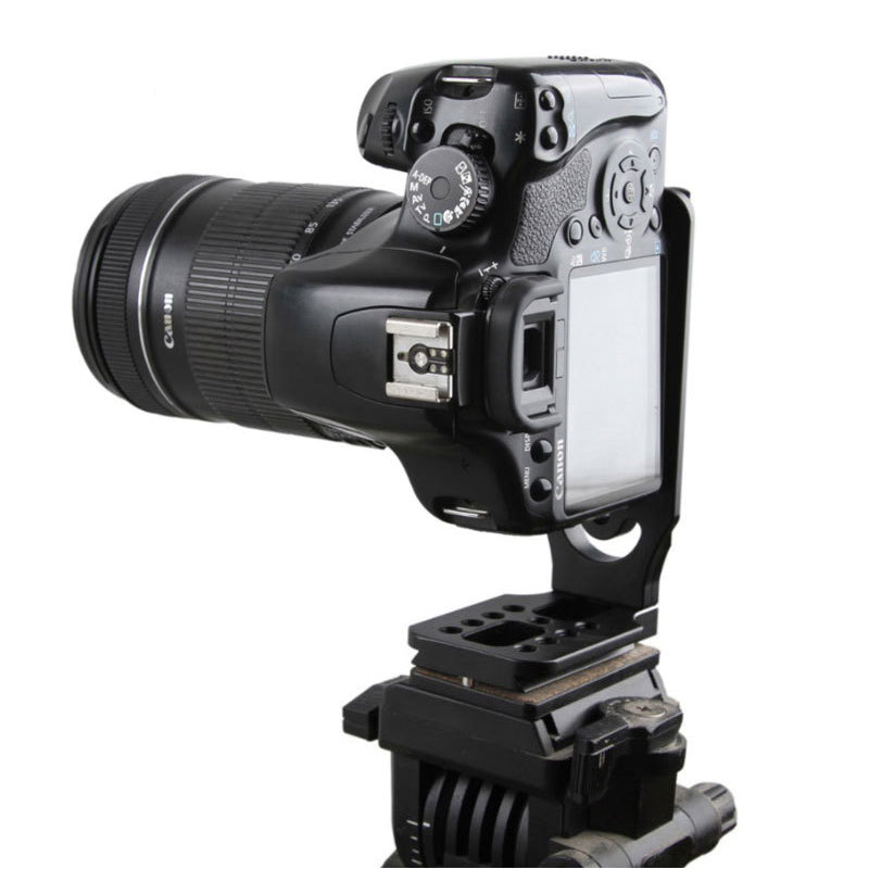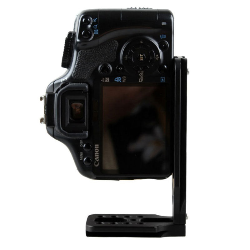 La placa en L multicámara está diseñada para adaptar el cuerpo de una cámara, independientemente de la marca o modelo, a una abrazadera compatible tipo Arca en orientación horizontal o vertical.. Al alinear una cámara con una de las ranuras de la placa en L multicámara, la ranura que corresponde a la mayor cobertura de la cámara Se debe elegir la base por la placa en L.