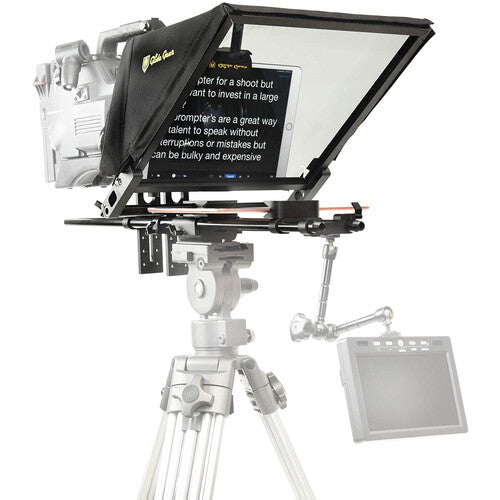 Plegable y versátil para teleprompting móvil o en estudio, este teleprompter para tableta con cámara de video profesional TMP 750 de 16.5 "de Glide Gear hace que agregar una tableta, teléfono inteligente o computadora portátil como su teleprompter a una DSLR profesional o la configuración de una cámara sin espejo sea fácil. La plataforma de aluminio duradera se puede ajustar fácilmente. verticalmente a la altura de su cámara, y es compatible con un sistema de varilla de 15 mm y cuenta con roscas de montaje de trípode de 1/4 "-20 y 3/8" -16 en la parte inferior, por lo que puede agregarlo a casi cualquier trípode móvil o de estudio plataforma.