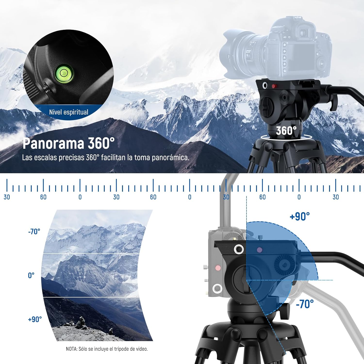 Captura vídeos de alta calidad utilizando este cabezal fluido de nivel profesional, que proporciona una panorámica de 360° y una inclinación de -70°/+90° para ángulos de disparo versátiles y movimientos suaves y controlados gracias a su avanzado sistema de contrapeso dinámico. y las capacidades de amortiguación de fluidos.