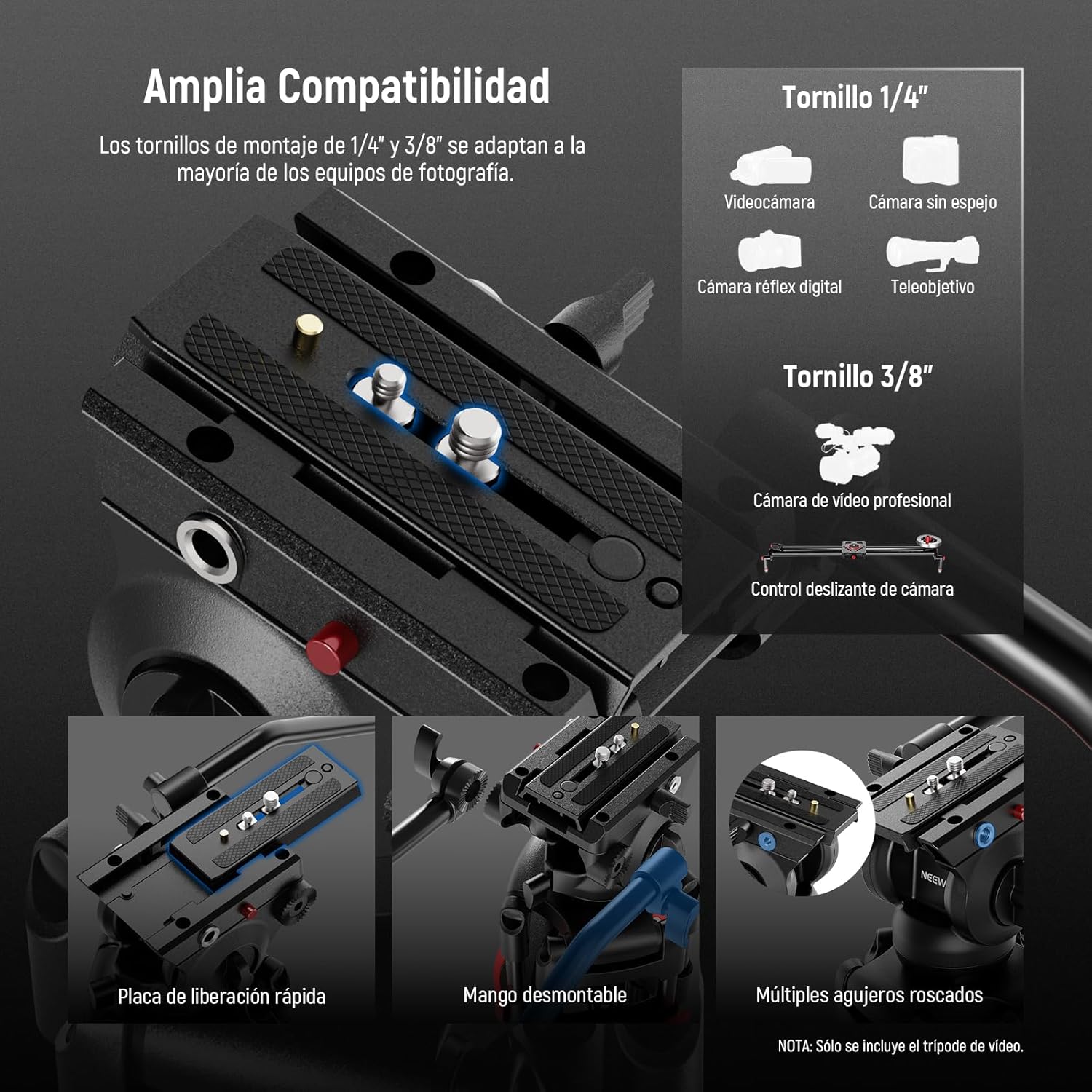 Los tornillos de montaje de 1/4" y 3/8" permiten una fijación perfecta de cámaras DSLR, videocámaras, cámaras sin espejo, cámaras de vídeo, deslizadores e incluso cámaras con teleobjetivos.