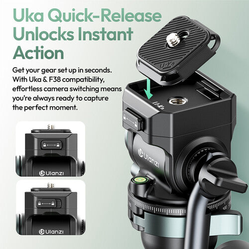El cabezal incorpora un bloqueo de seguridad para la placa de liberación rápida tipo Arca Ulanzi Uka incluida, que sujeta firmemente el equipo de cámara.