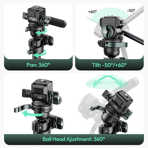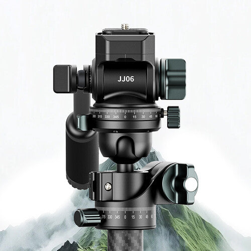 El trípode JJ06 incluye una herramienta multicabezal que se enrosca en la parte inferior del mango panorámico para facilitar su uso. Acceso.